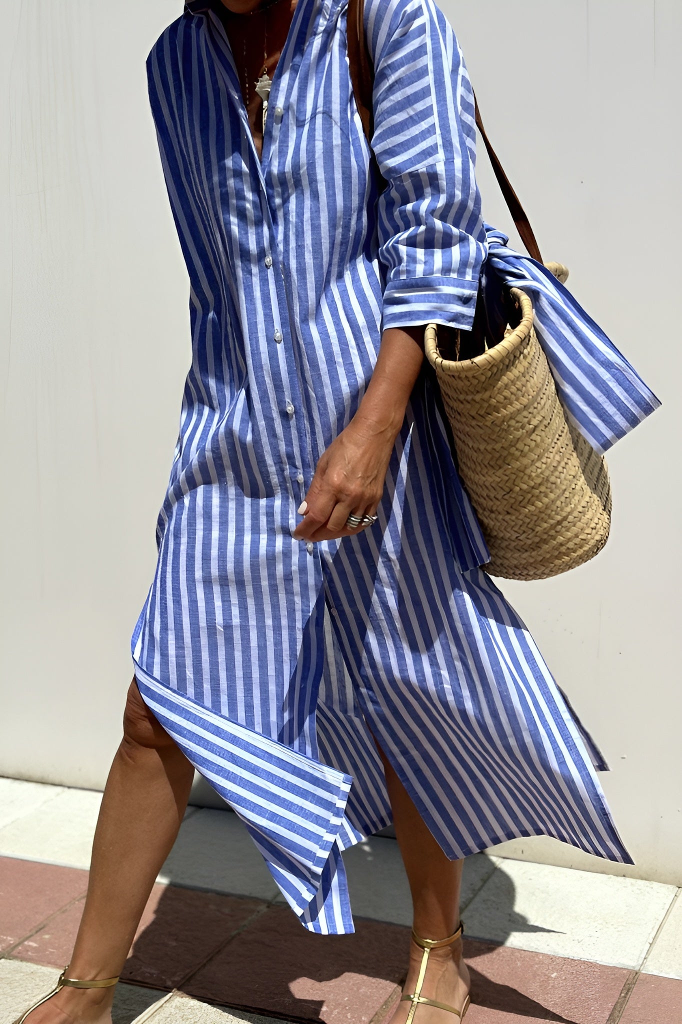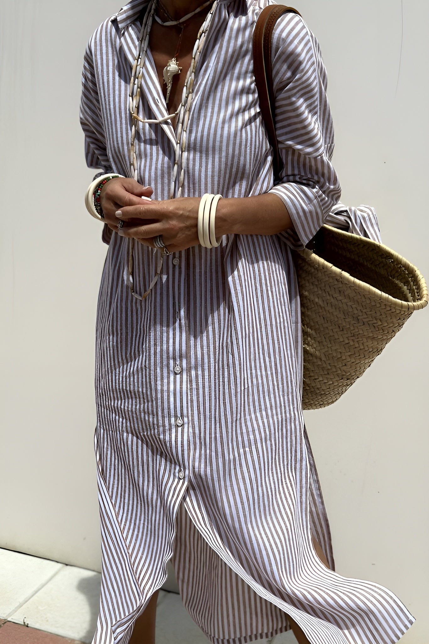 De diskreta ränderna, den eleganta kragen och den följsamma silhuetten ger klänningen en klassisk men samtidigt uppdaterad look. Du ser alltid välklädd ut – utan ansträngning.